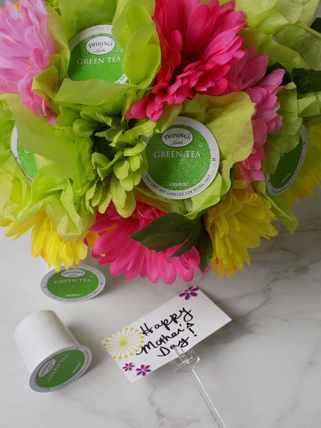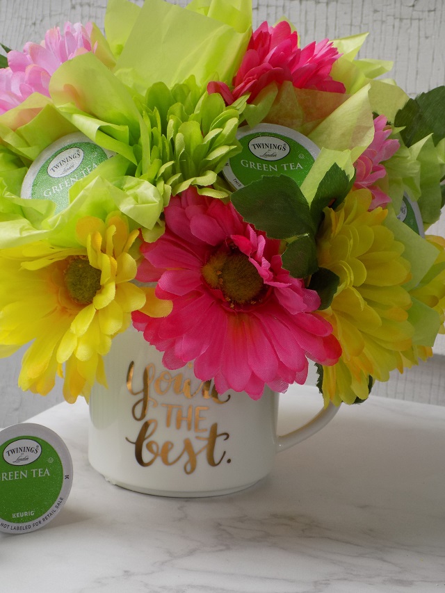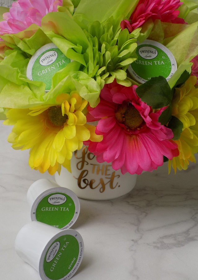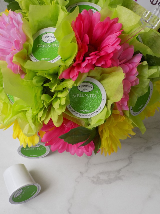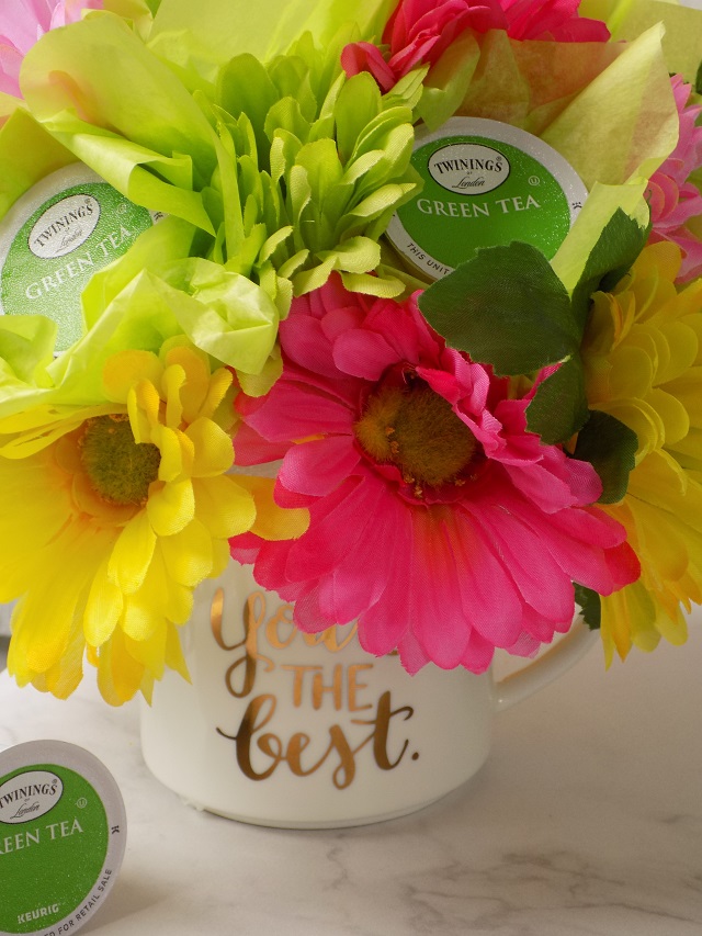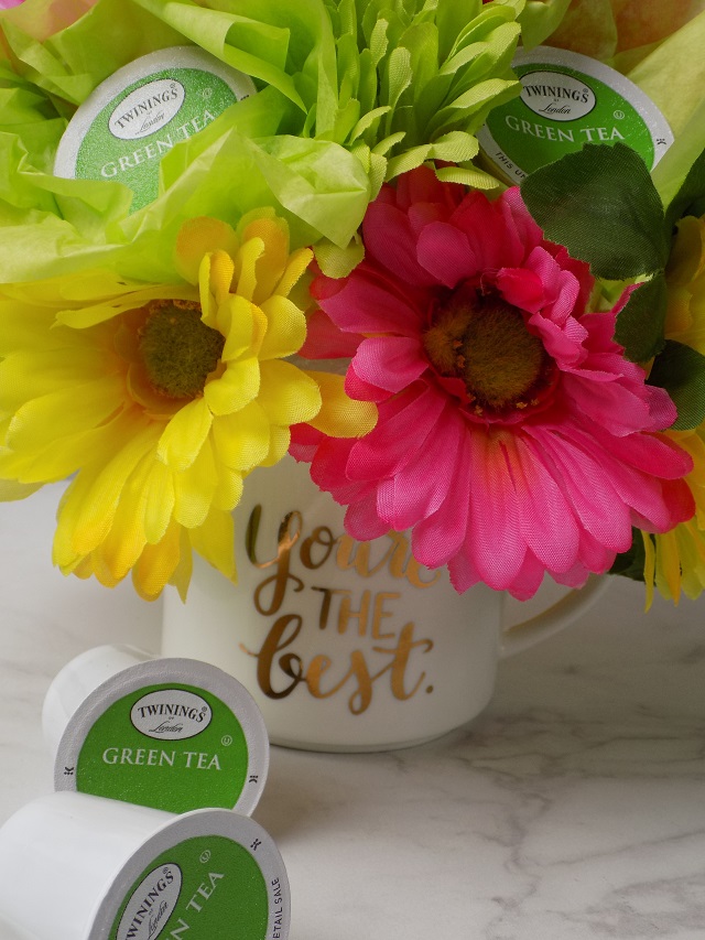 These are so simple to make, and only take about 15-20 minutes to assemble once you have all of your supplies ready. I made this arrangement with Twinings Green Tea, and big bright blooms. I absolutely love how it turned out! In total I assembled 10 of these cute little K-Cup Bouquet flower arrangements for all of the special moms in my life, and I can't wait to gift them this Mothers Day.