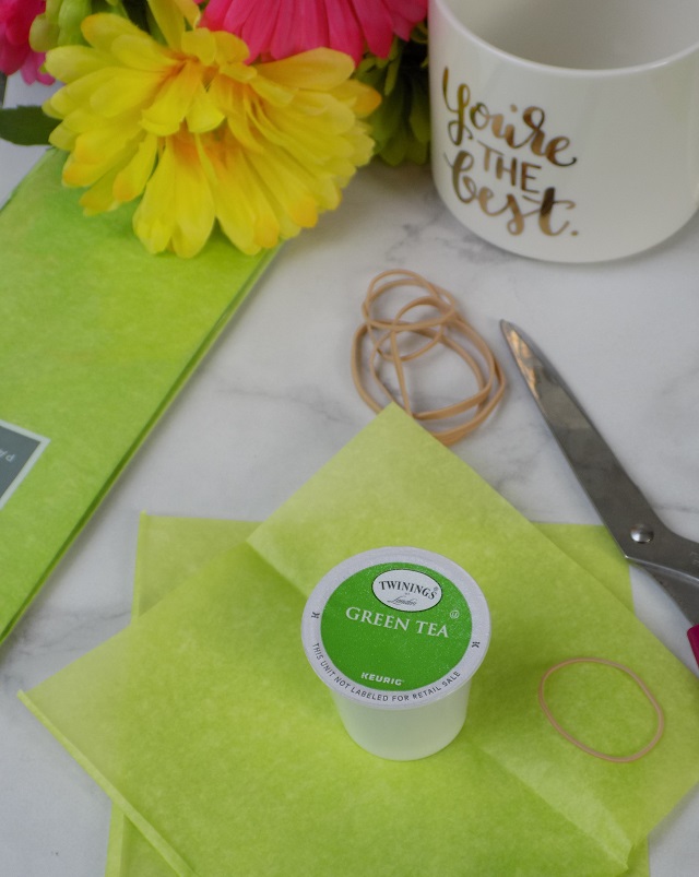 - Starting with your K-Cups, arrange two pre-cut squares of tissue paper (as pictured below). Place a K-Cup (top up) in the center. Bunch the tissue up around the sides and wrap/affix it with a rubber band. Repeat this step until each K-Cup is wrapped.Set to the side.