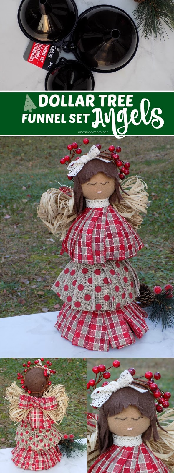 While I love to craft, in all honesty, I'm a bit of a procrastinator when it comes to procuring the necessary supplies. I always make a mental note to grab some of the cone foam forms from Dollar Tree, when they're not in demand (in the summer.) Alas, I have yet to follow through. A few years back, I ended up making these fun Dollar Tree funnel set Christmas trees, (using a 3 piece funnel set as a foam cone alternative) and sharing them here with all of you. At that point it became pretty clear that I'm not the only one that procrastinates buying foam forms! It became a popular pin for those who were also looking for an alternative to the traditional foam cone form. The following year, I decided to make these pretty Dollar Tree funnel set Angels, using ribbon, a funnel set, raffia and a handful of simple supplies all found at dollar tree (aside from the felt and embroidery thread used for the face/hair.) After crafting with these funnel sets as an alternative for three years now, I’ve decided that I like the height that the funnel sets allow. The foam forms are about 10" at Dollar Tree, These Funnel sets, when assembled properly, allow for a height of between 16"- 18". I love how adorable this DIY Dollar Tree Snowman ( or Snowwomen?!) turned out! My oldest daughter actually thought I purchased it from Home Goods (not a bad compliment at all, right?!) Ready to make your own DIY Dollar Tree Funnel Set Snowman?
